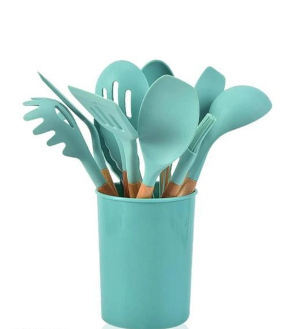 12-piece cookware set with durable silicone heads and bamboo wood handles. DURABLE-Safe for use on all non-scratch cooking surfaces, including non-stick cookware. Ergonomic Design: Smooth wooden handle provides a comfortable grip for easy use. Essential kitchen spoons to cover all your daily needs. It adapts perfectly to all types and Professionals, enthusiasts, and beginners alike can enjoy high-quality kitchen tools designs of kitchen. Essential kitchen items for everyday use. CONVENIENT STORAGE - The plastic utensil holder helps you store utensils conveniently. Also, the hanging loop at the end of each utensil is for easy carrying and ventilation. What makes our silicone kitchen tools different? Scratch resistant food contact safe silicone for nonstick cookware. Modern and functional design, easy to handle. High heat resistance (-22°F/-10°C to 392°F/150°C) Non -slip beech wood handles, stylish and practical. Stain resistant. Easy to clean or wash. 12 piece kit: 1 deep soup ladle. 1 solid serving spoon 1 Slotted Spoon/Colander 1 slotted spatula. 1 pasta server. 1 flexible spatula. 1 basting brush 1 whisk. 1 tweezers 1 round spatula. 1 turner. 1 plastic utensil holder Tips: We suggest not to stay in hot cookware for a long time. Not dishwasher safe. To protect your utensils, gently rinsing under warm water is the best way to clean these rubber kitchen u